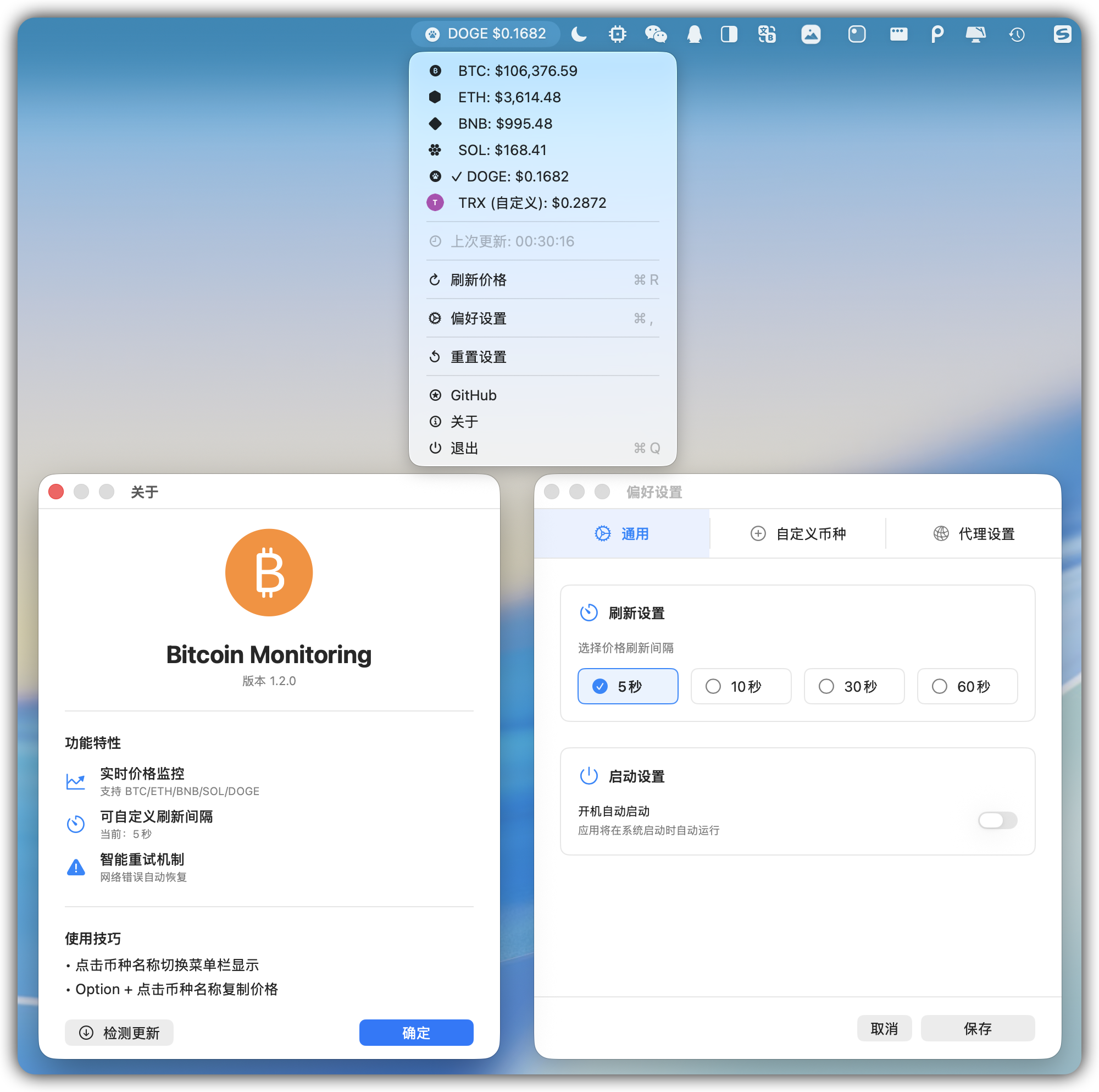 BTCRefreshInterval: 刷新间隔设置SelectedCryptoSymbol: 选中的默认币种LaunchAtLogin: 开机自启动CustomCryptoSymbols: 自定义币种列表 (JSON数组)SelectedCustomSymbolIndex: 当前选中的自定义币种索引UseCustomSymbol: 是否使用自定义币种ProxyEnabled/ProxyHost/ProxyPort/ProxyUsername/ProxyPassword: 代理设置(包括认证)OptionClickAction: 选项点击操作设置