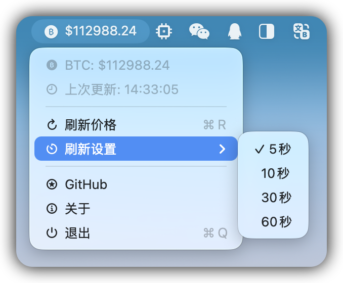 - 实时价格显示: 在菜单栏实时显示 BTC/USDT 价格